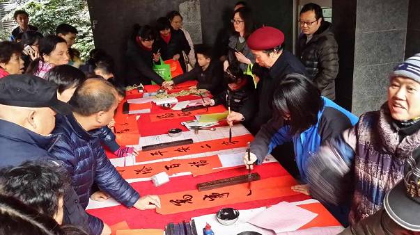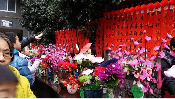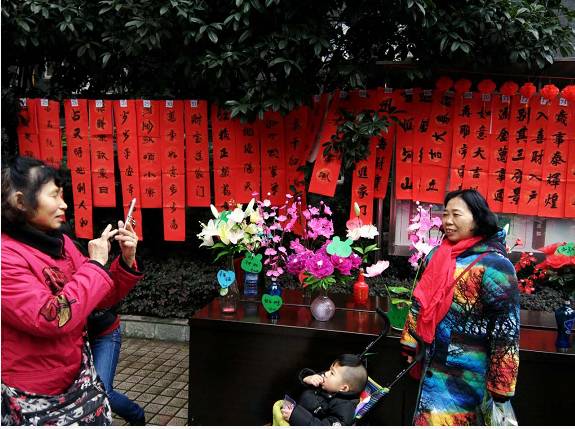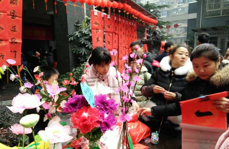银桥社区“百花千联迎新春”活动,今天在新蓝湾小区举行,社区老年大学手工班学员制作的近百枝“鲜花”和书法班学员书写的数百幅春联,给整个小区打扮的春意盎然。